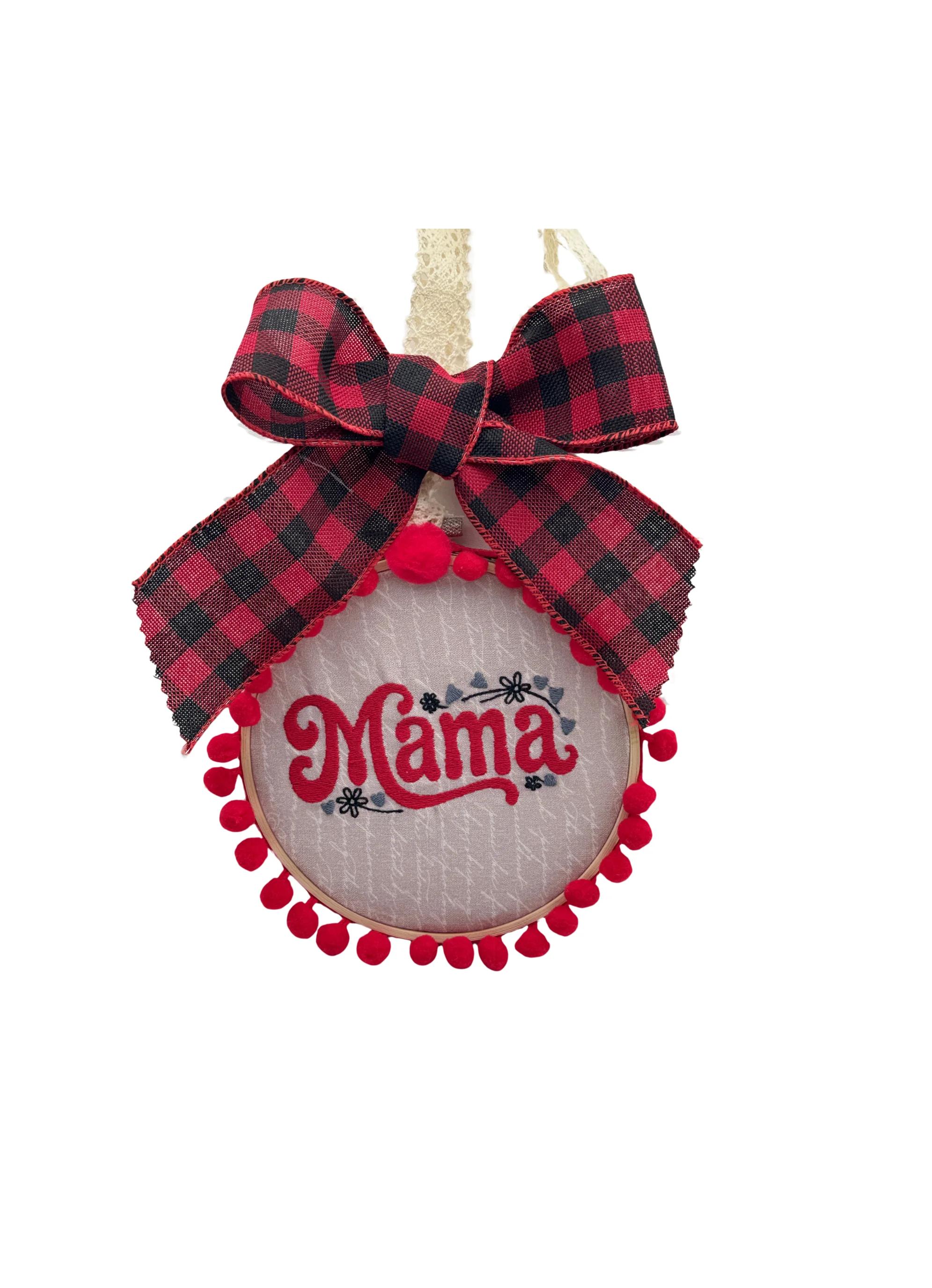 Bastidor de madera con bordado Mamá en tonos rojos ideal para el día de la Madre.