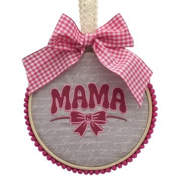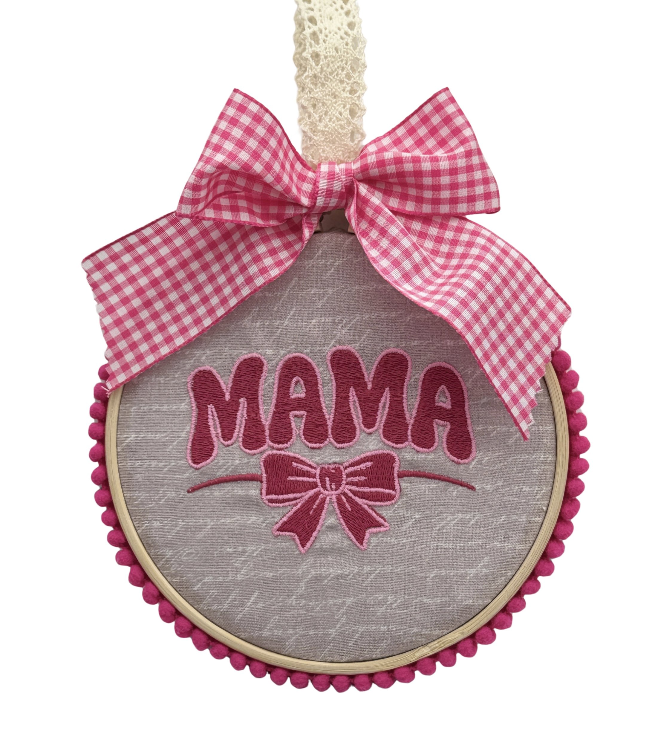 Si Bastidor diseñado en tonos color rosa y fondo beige, ideal para el día de la Madre. La palabra  MAMÁ en bordado y decoración con lazo Vicky de cuadros rosa y blanco.