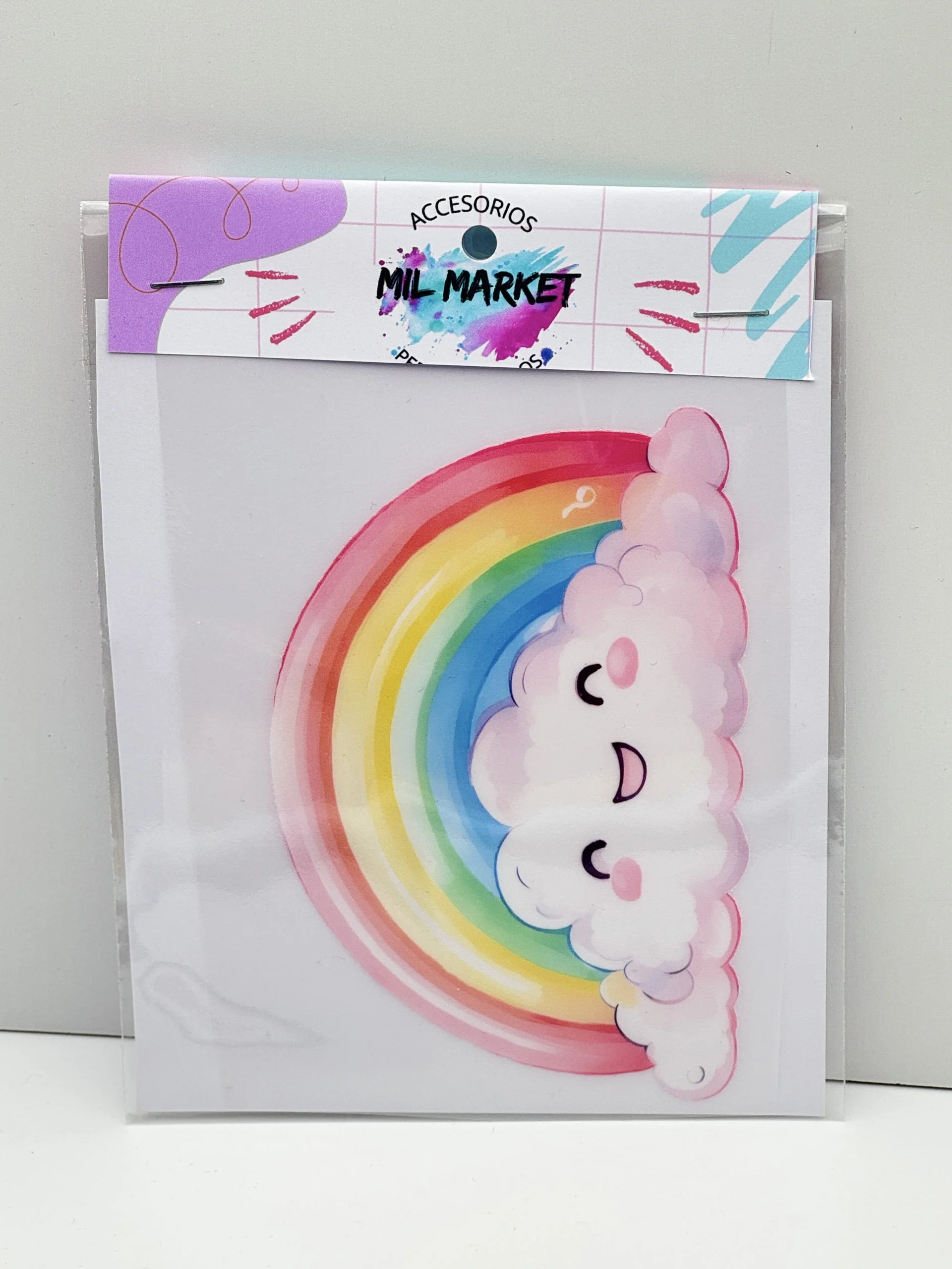 Lámina impresa en material de DTF para planchado en casa. Diseño Infantil de Arco Iris y nube. Tenemos infinidad de diseños, puedes pedir el que necesites. Tamaño del diseño 13x9cm. Enviamos también instrucciones de colocación.