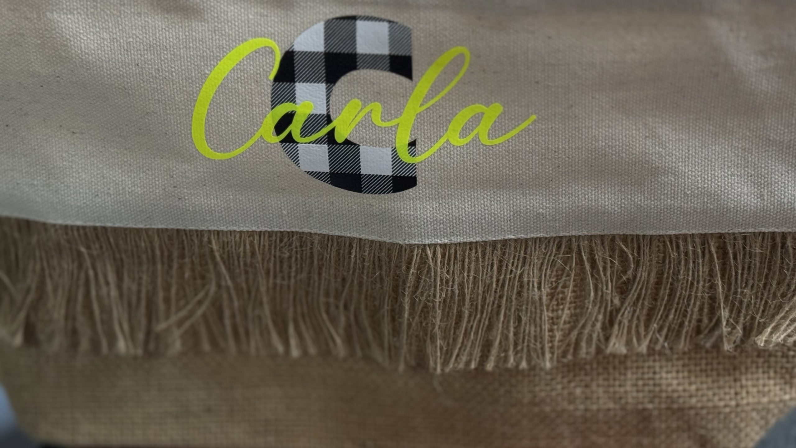 Neceser con material de yute y flecos a modo decorativo. Podemos personalizar con la inicial en cuadros vichy negro y el nombre en vinilo fluorescente.